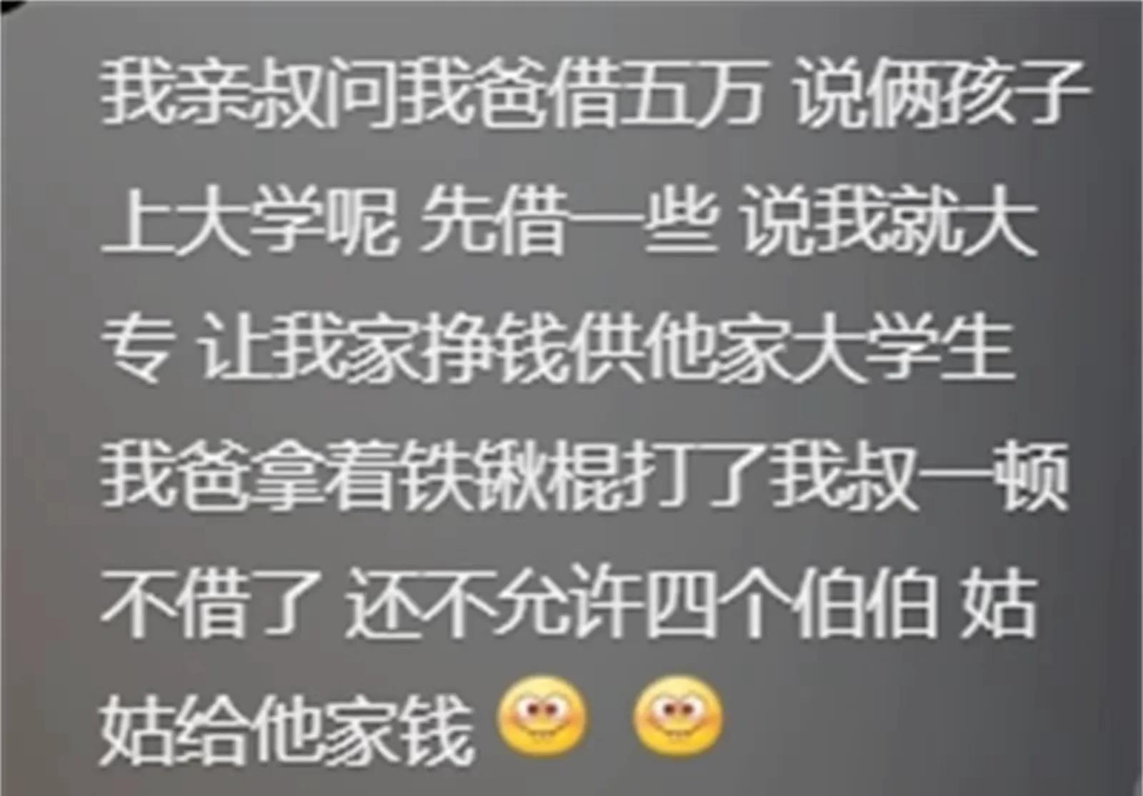 11年的时候,我表姐突然在QQ上说我要当富二代了,我都一脸懵,回去问我你们啥意思?他们说我家的果园要卖出去,可能值100多万,但是那个时候我弟还小学,我爸妈拿着钱也是准备重新换个果园。我姑父(表姐的爸)跟其他人说,我家卖果园的钱,至少应该分给他一半,我爸妈当时开始弄果园,这些亲戚全是说风凉话的,钱也不想借,看着赚钱了还想来分钱